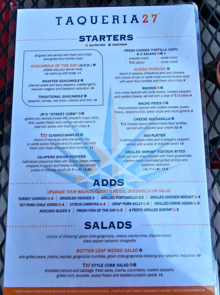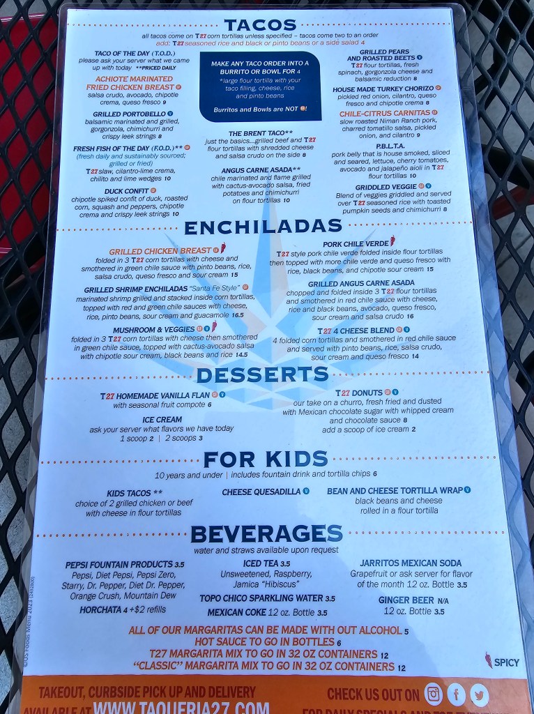 Summer evenings are made for outdoor dining. Dinner becomes a special occasion in which you slow down, savor the shade and gentle breezes, and watch the sunset while catching up with friends and sharing some of your favorite foods. A friend and I took the opportunity to dine on the patio at Taqueria 27 in Holladay last week. From beverages to desserts, we relished each part of our experience.