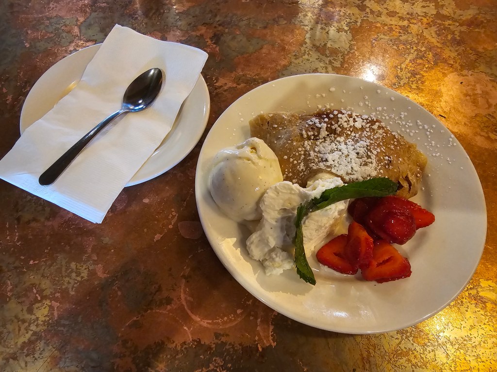 Not having eaten there before, I was open to recommendations. First, Kaleb recommended that I start with a Czech pilsener which is a house favorite that blends pilsener malt and saaz hops. It proved to be a very good choice as the flavor was hearty and well-balanced, but not too bitter from the hops. Next, Kaleb suggested that I try the Bohemian schnitzel which comes with a choice of lightly breaded chicken or pork, garlic mashed potatoes, beurre blanc sauce, and steamed vegetables. I opted for chicken which was very tender, and the breading was delicate and crispy. The beurre blanc sauce had a hint of lemon which complemented the savoriness of the meat. The vegetables were lightly seasoned as well which added to the overall flavor of the dish. I finished the meal by indulging my sweet tooth with a serving of apple strudel. The strudel arrived beautifully presented with a scoop of vanilla ice cream, freshly whipped cream, sliced strawberries, and mint leaves. It was the perfect, subtly sweet ending to a lovely experience.