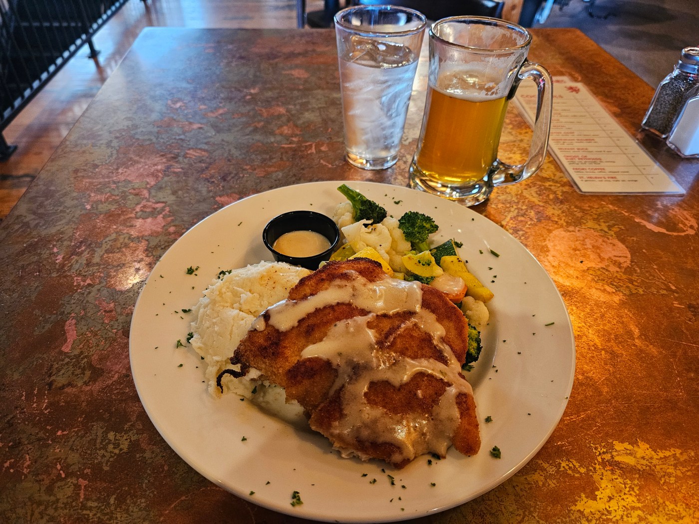 Not having eaten there before, I was open to recommendations. First, Kaleb recommended that I start with a Czech pilsener which is a house favorite that blends pilsener malt and saaz hops. It proved to be a very good choice as the flavor was hearty and well-balanced, but not too bitter from the hops. Next, Kaleb suggested that I try the Bohemian schnitzel which comes with a choice of lightly breaded chicken or pork, garlic mashed potatoes, beurre blanc sauce, and steamed vegetables. I opted for chicken which was very tender, and the breading was delicate and crispy. The beurre blanc sauce had a hint of lemon which complemented the savoriness of the meat. The vegetables were lightly seasoned as well which added to the overall flavor of the dish. I finished the meal by indulging my sweet tooth with a serving of apple strudel. The strudel arrived beautifully presented with a scoop of vanilla ice cream, freshly whipped cream, sliced strawberries, and mint leaves. It was the perfect, subtly sweet ending to a lovely experience.