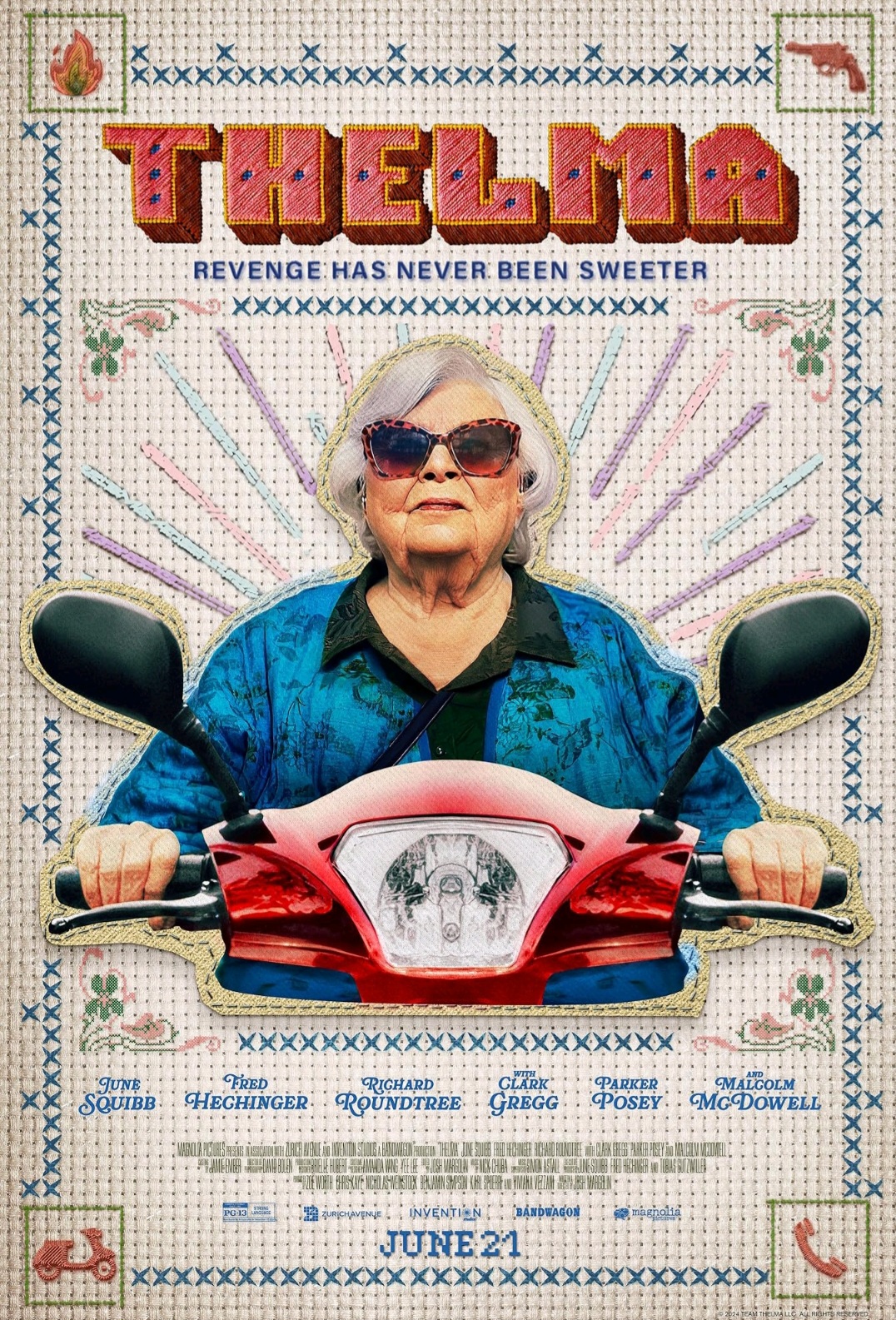 Thelma (June Squibb) is a 93-year-old widow who lives alone in her home and occupies her time with simple daily activities. She has a close relationship with her 24-year-old grandson Danny (Fred Hechinger), who is adrift in his own life, lacking confidence in his abilities and a sense of purpose, but who checks on his grandmother frequently and lovingly helps her navigate changing technology. Thelma receives a phone call from someone claiming to be Danny, stating that he is in jail and requesting $10,000 in cash to get him out. Panicked and believing the phone call is real, Thelma notifies family members, gathers the money, puts it in an envelope, and mails it to the address the caller gives her. Back at home, Thelma’s daughter Gail (Parker Posey), son-in-law Alan (Clark Gregg), and Danny help her to see that she was scammed. When she leaves the room, the family also has a conversation about whether or not she is fit to continue living on her own. The family meets with Detective Morgan (Chase Kim) to report the scam, but he gives them little hope of recovering Thelma’s money. Initially feeling frustrated and defeated, Thelma finds her internal determination, draws inspiration from seeing Tom Cruise on the front-page of a newspaper advertising Mission Impossible, puts on her athletic shoes, and goes to work getting her money back. She retraces her steps to a public restroom where she discarded the scammer’s address on a crumpled piece of paper. Luckily, the paper is still there, giving her a location to pursue. Thelma no longer drives, so she asks Danny to give her a ride to the assisted living facility where her friend Ben (Richard Roundtree) resides because she knows that he has an electric scooter that she can use as alternative transportation to track down the scammers. Through some smooth talking and sleight of hand, Thelma acquires Ben’s scooter. He is unwilling to let her go alone, so he impulsively joins her ambitious undertaking. The pair’s hasty exit escapes Danny’s notice, leading him, the rest of the family, and the facility staff to worry that Thelma and Ben have become missing persons, unaware of what they are doing. Thelma and Ben stop at their mutual friend Mona’s house (Bunny Levine) to obtain her gun, and then they proceed to search for the scammers’ address. They find it after the sun goes down — a lamp shop located in an isolated part of town, far from where they started. Thelma boldly enters the shop and confronts the father and son duo who took her money.