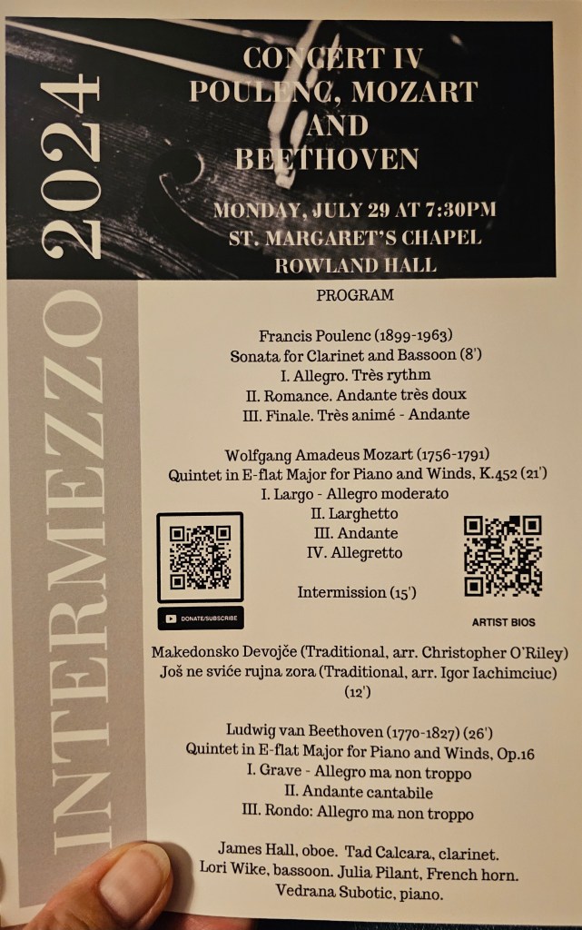 Attending Intermezzo Chamber Music concerts is one of the highlights of the summer for me. I had to miss several concerts in this summer’s series due to other commitments, so I was thrilled to attend Concert IV on July 29, 2024 and Concert V on August 12, 2024. The Intermezzo Chamber Music Series has usually taken place at the Vieve Gore Concert Hall on the campus of Westminster College in Salt Lake City, but this summer, the series relocated to the Libby Gardner Concert Hall on the University of Utah Campus and St. Margaret’s Chapel at Rowland Hall. Concert IV at St. Margaret’s Chapel presented fantastic music for piano, woodwinds, and brass. Utah Symphony artists James Hall (oboe), Tad Calcara (clarinet), Lori Wike (bassoon), and Julia Pilant (French horn) joined Intermezzo’s Artistic Director and pianist Vedrana Subotic in presenting the evening’s program.