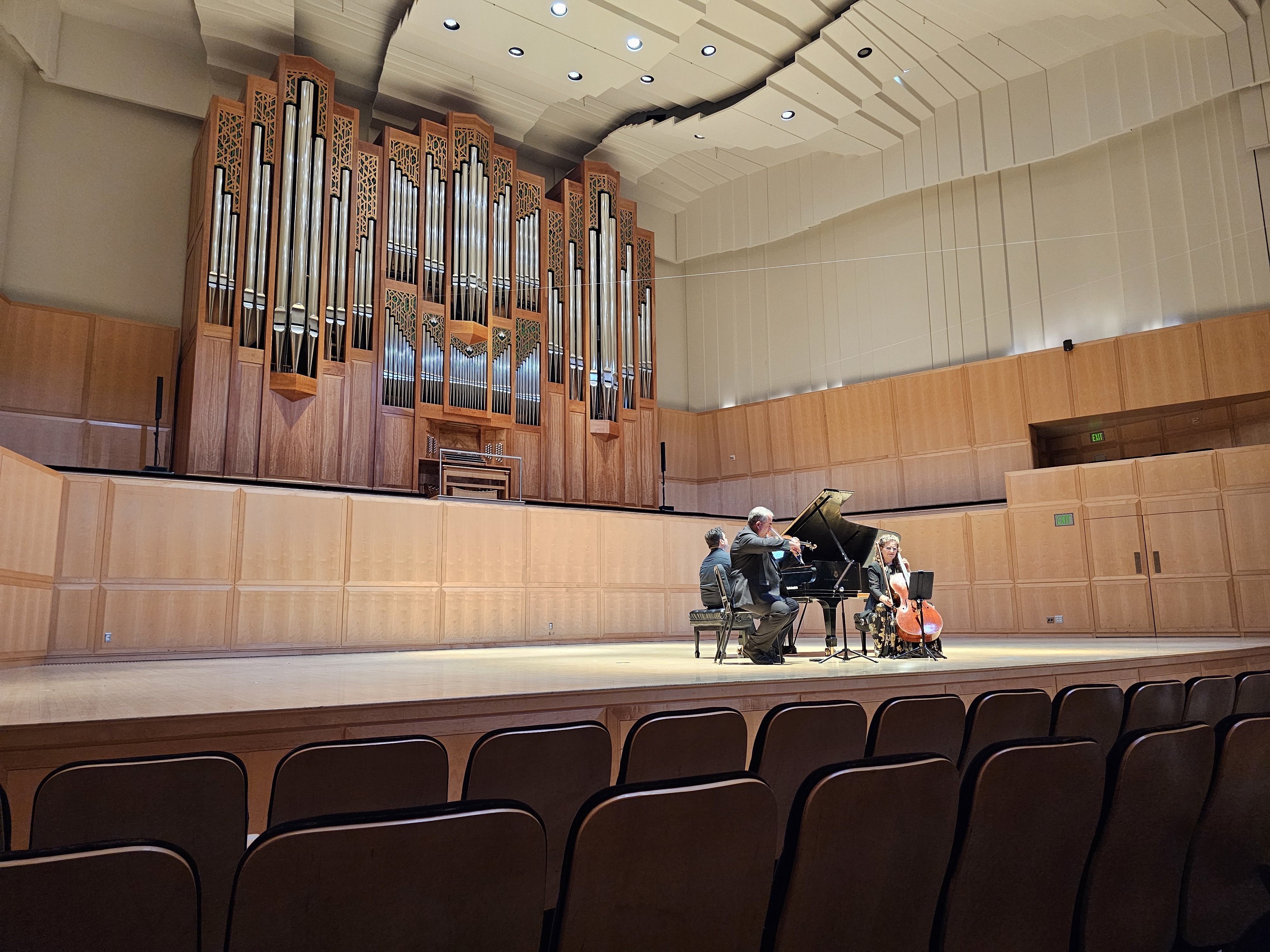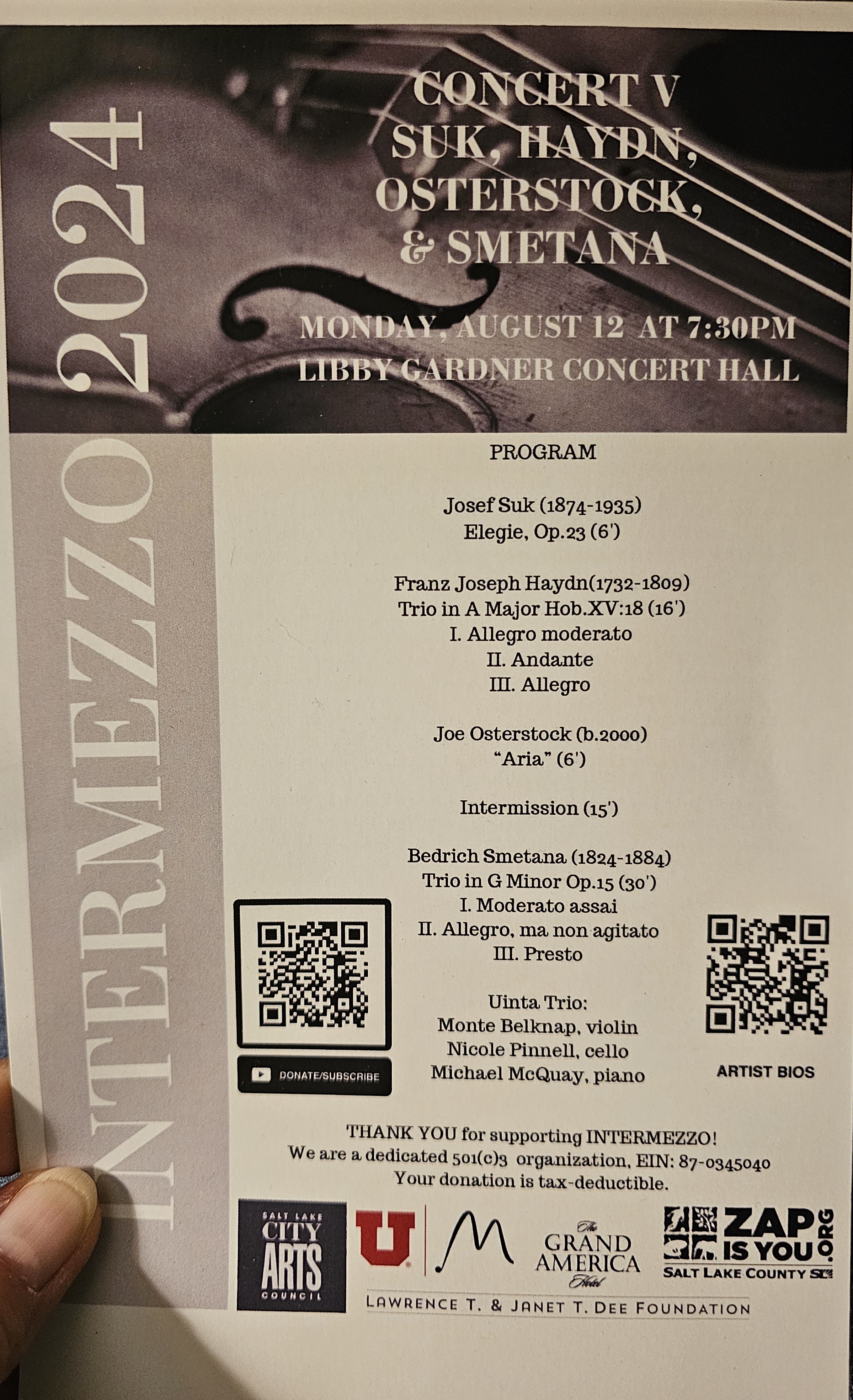 I attended the final summer concert of Intermezzo Chamber Music Series on August 12, 2024 with my friends Ruth, Nancy, and Nancy’s mother. All of us love classical music, and we were particularly thrilled to attend this concert because Joe Osterstock, a rising new composer whose work was being performed, is Nancy’s nephew. The concert featured his piece titled “Aria,” along with works by Josef Suk, Franz Joseph Haydn, and BedÅ™ich Smetana. The Uinta Trio — Monte Belknap (violin), Nicole Pinnell (cello), and Michael McQuay (piano) — performed the evening’s program in the Libby Gardner Concert Hall on the University of Utah campus. All of the evening’s music exquisitely embodied intensity and passion.