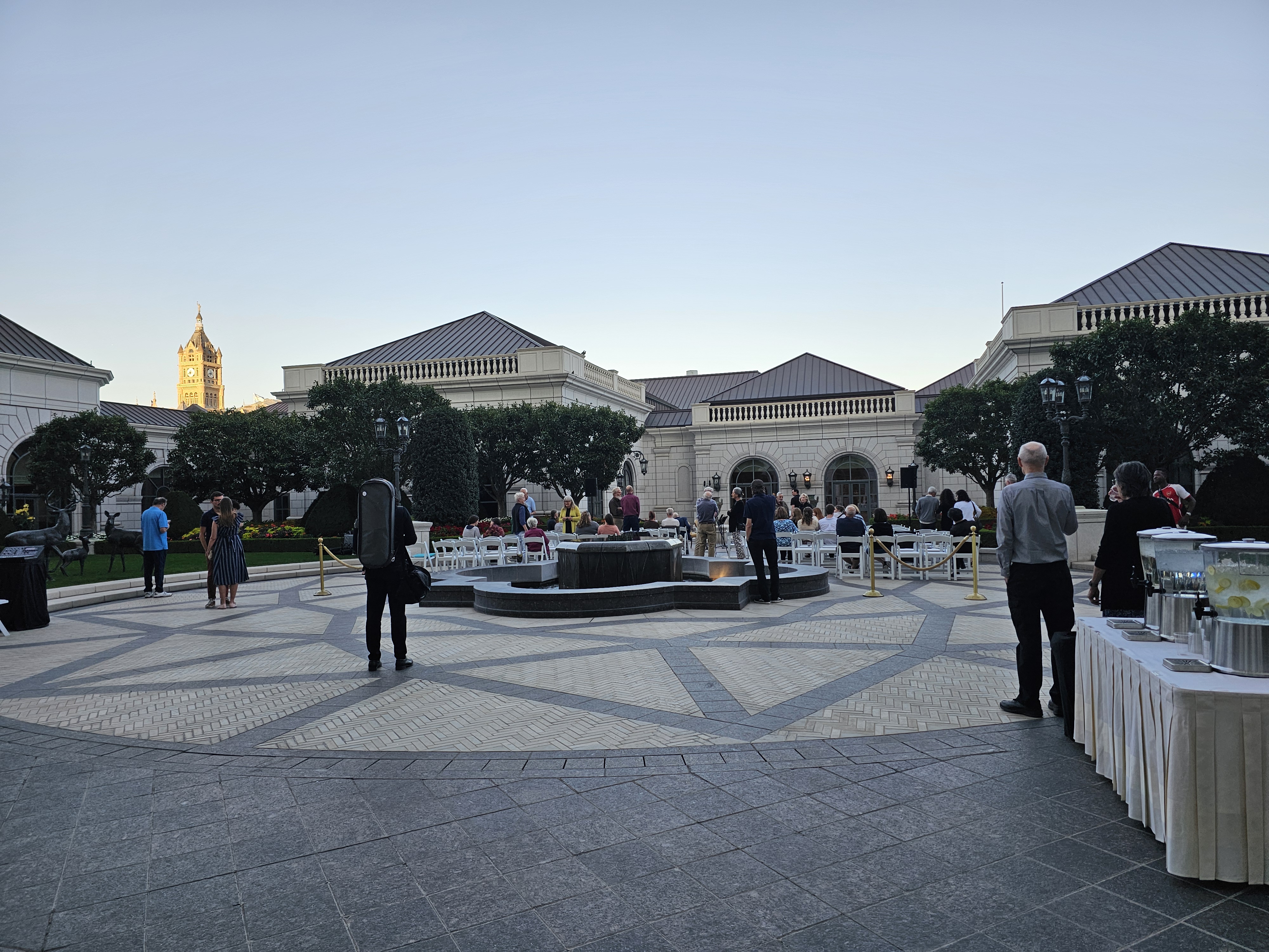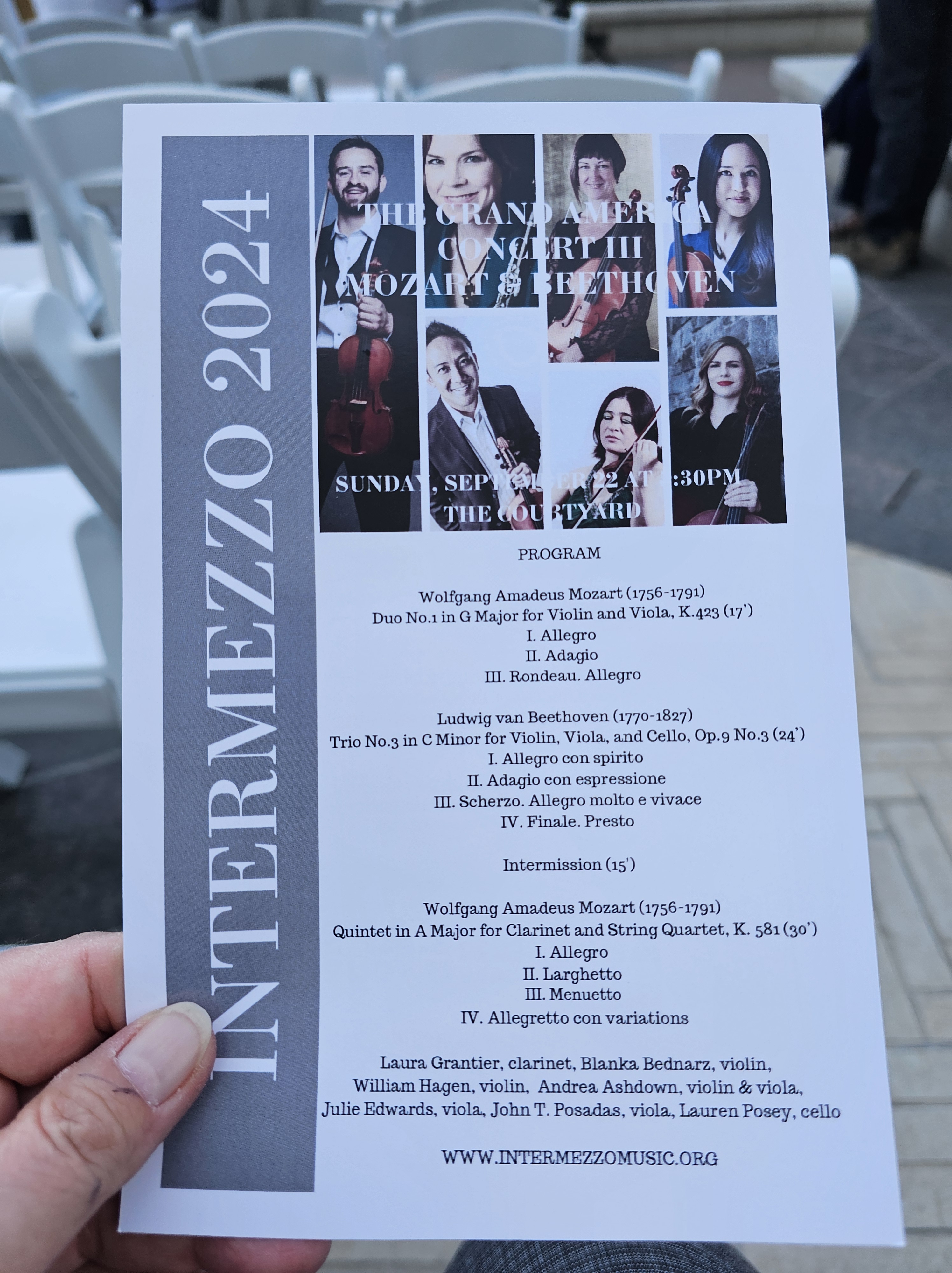 On a breezy Sunday evening with a gentle waterfall flowing in the background, Intermezzo Chamber Music Series held the third concert of its fall season in the courtyard of The Grand America Hotel. Laura Grantier (clarinet), Blanka Bednarz (violin), William Hagen (violin), Andrea Ashdown (violin and viola), Julie Edwards (viola), John T. Posadas (viola), and Lauren Posey (cello) performed works by Mozart and Beethoven that included several outstanding highlights and beautifully demonstrated the complementarity of woodwinds and strings.