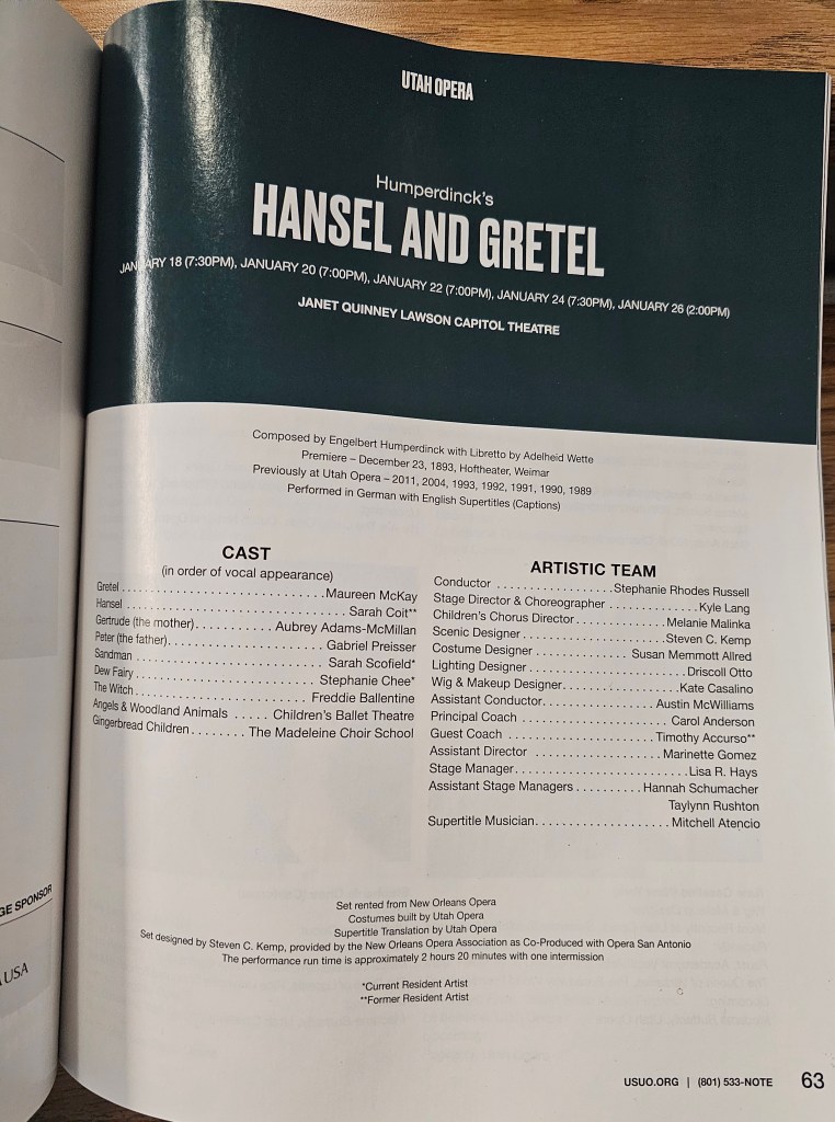 For two years running, January 20th has found me at Capitol Theatre enjoying a Utah Opera production. Last year, I was there to see Portman and Wright’s The Little Prince. This year, I went to see Humperdinck’s Hansel and Gretel. I found the production to be a delightful adaptation of the fairytale — featuring a lush score, dynamic singing and character interpretation, and effective sets and lighting.