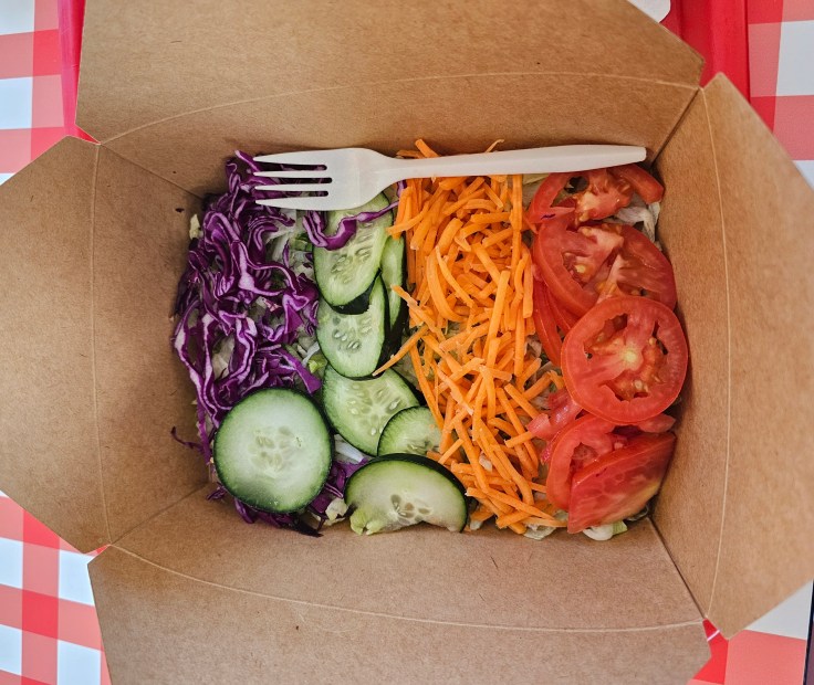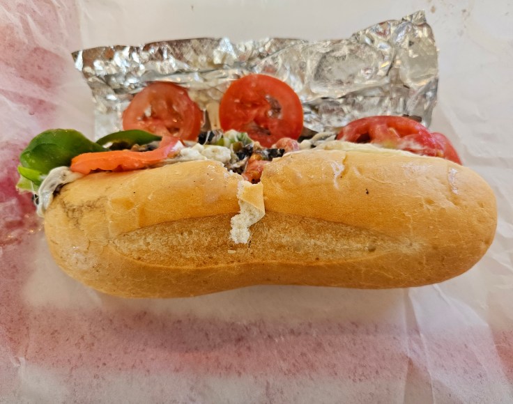 I decided to try a 6-inch Fungi Philly, which is a vegetarian spin on a Philly cheesesteak. (10-inch subs also are available.) Grilled mushrooms replace the meat, and melted provolone, grilled onions, bell peppers, sliced tomatoes, and mayo top the sandwich. I ordered a “small” salad as a side, and the young woman who took my order suggested that I add olives, which come as part of a “giardiniera” — an Italian relish of pickled vegetables in vinegar or oil. The ingredients on the sandwich and in the salad were fresh and flavorful. Calling the salad “small” is a bit of a misnomer as it comes in a large to-go box and could easily be shareable. The mix of olives in the giardiniera were a particular treat, having a little kick that was equal parts savory and spicy. I also absolutely loved the soft, fresh bread for the sandwich whose texture was consistent throughout.