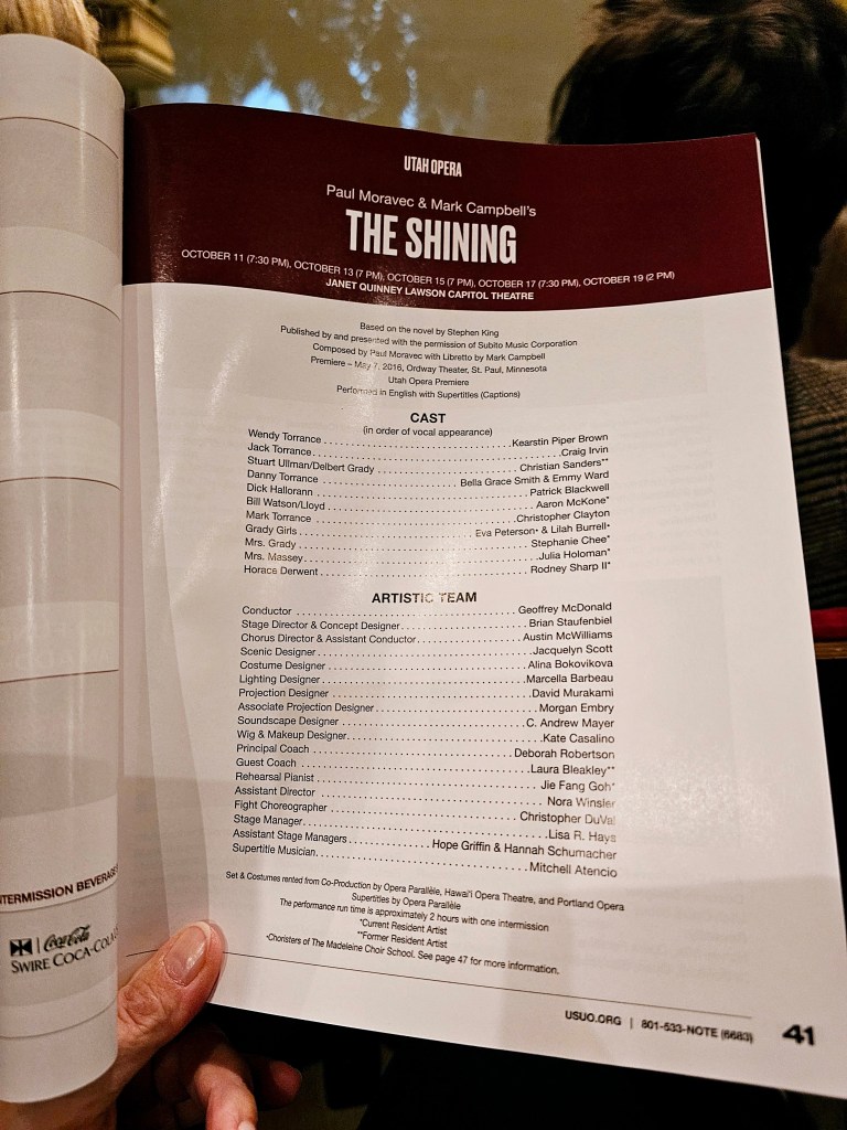 Utah Opera’s 2025-2026 season announcement immediately piqued my curiosity since the company would be opening with composer Paul Moravec and librettist Mark Campell’s adaptation of Stephen King’s The Shining. I admit to not having been an avid Stephen King fan over the course of my life, but I was nevertheless very intrigued to see how this well-known horror story would translate into an opera. I eagerly awaited the start of the opera season, and I purchased tickets to see The Shining with my friend Mony for opening night!!