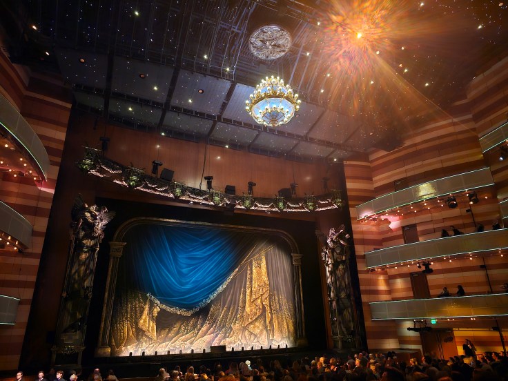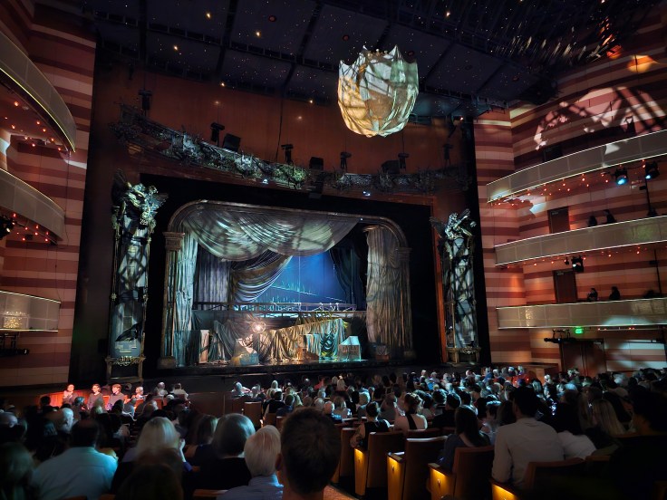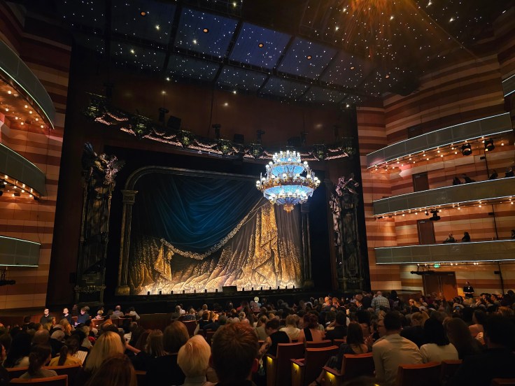 While I enjoyed the version of Phantom of the Opera that I saw in 2018, this current production surpasses it! The creative team in 2018 utilized updated costumes and staging which were understated and restrained compared to the original. Currently, audiences are again able to enjoy the opulence and glamour they had known and loved in earlier versions. This is notable in Carlotta and Ubaldo’s vibrant costumes, and Madame Giry’s costume, though black, has more sheen and sparkle than in 2018. Even more stunning is the staging of the Phantom and Christine’s descent to his underground lair, once again illumined by multiple candelabras. Equally magnificent is the return of the grand staircase during “Masquerade” and the more elaborate interpretation of the Red Death. Reincorporating these elements thoroughly elevates the sensory impact of the production!